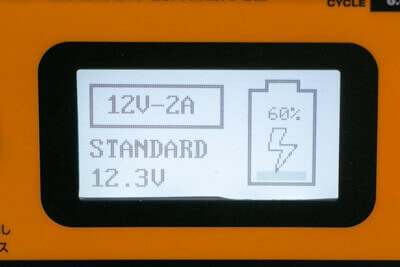 バッテリーの種類がStandardで2Aで充電する場合はそのままSTART/STOPボタンで開始。バッテリーの種類がAGM/ディープサイクル/ISS(アイドリングストップ)の場合は[バッテリー選択]ボタンで切り換える必要があります。何もしなければ30秒後に12Vバッテリーの場合は[STANDARD 12V/2A](24Vの場合は12A)で充電が自動で開始されます。