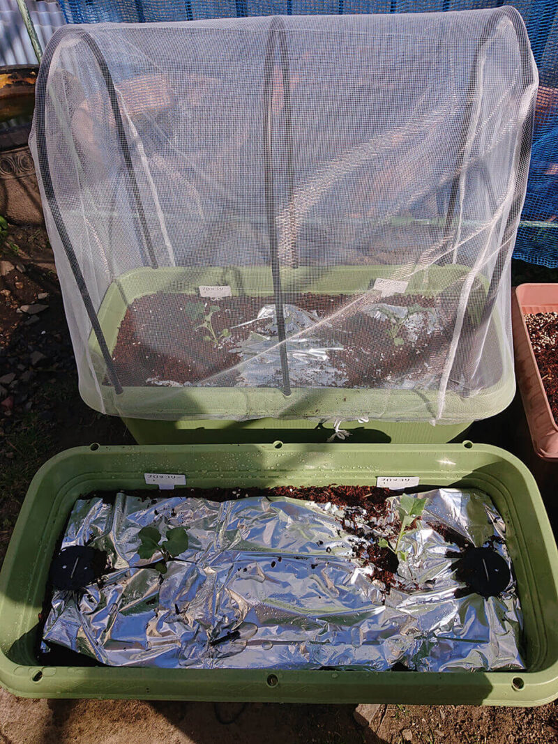 秋冬では寒さ防止にプチプチシートを巻いて、土の上にはわらを敷いていました。凍るほどの寒さが続かなければ日当たりが良ければ冬でも育ちます。終わったら藁はビニール袋に入れて乾燥させておくと、翌年も使えます。