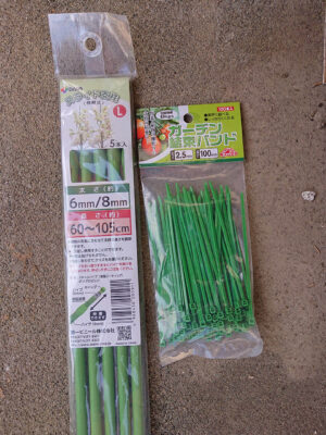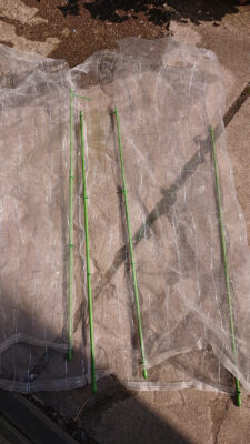 「虫よけちゅーぶ 1.3m」は9mmの1.2mの緑色のガーデニング支柱を対角に挿して、カバーで包んでいます。ブロッコリーは結構上に伸びてくるので余裕を持たせています。幅が1.3mのチューブなら外側も葉っぱが広がる余裕があります。上が突き抜けるチューブ状なので必要な長さで切って、上は丸めたり折り曲げて塞いでクリップや洗濯ばさみで止めます。