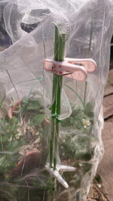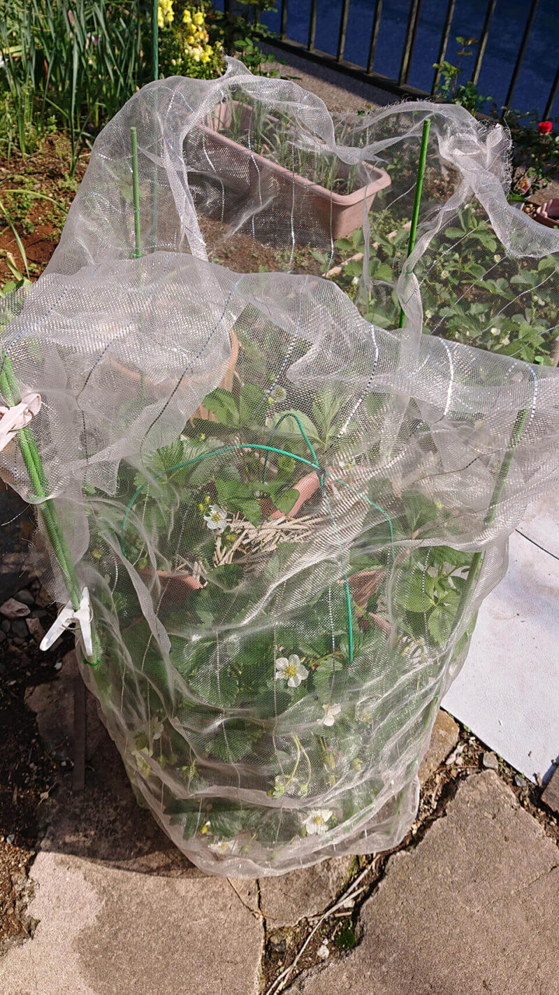 イチゴも収穫できそうなのが鳥さんに食べられてしまったので、同じように被せました。虫除けちゅーぶは長さが3mのチューブ状になってるので、必要な長さで切って、上側を丸めて洗濯ばさみで止めます。鳥よけには雑で良いですが、虫除けには隙間をきっちり締めないと入られてしまいますので注意が必要です。