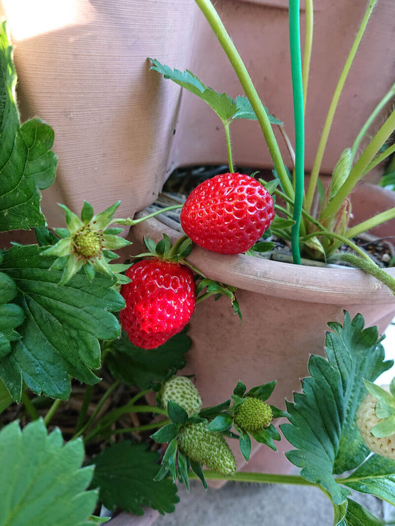 イチゴの鉢は「ハーベリーポット」を3段重ねにしています。種類が違うイチゴを管理しやすいのでおすすめです。イチゴを美味しく育てるにはイチゴ用の土と肥料を使うのポイントです。