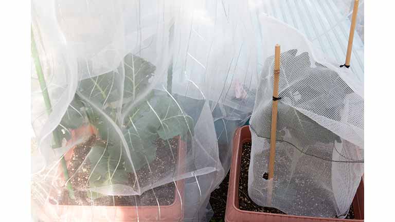 苗が小さい間は「苗カバー6号」を使い、大きくなったら「虫よけちゅーぶ 1.3m」をプランターごとすっぽりと被せました。