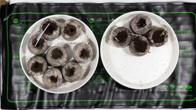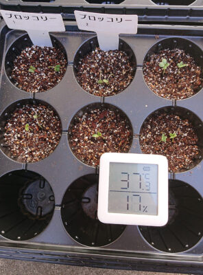 暗いときに高い温度でヒョロヒョロと徒長してしまうのを防ぐために夜間は低めの温度設定にしています。種の場合は芽が出るまでは夜間も発芽適温を維持するのが良いです。そうすると少ない日数で発芽してくれます。