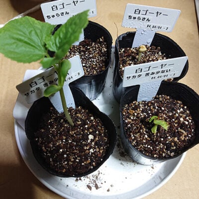 ゴーヤの場合は発芽適温は25~30℃、芽が出てからは日差しに当ててるときは高くなりますが、夜間の徒長を抑えるために温度を上げるときは20℃を目安にしています。