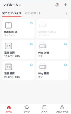 プラグと温湿度計がクラウドに接続できていることを確認します。クラウドに接続されていないとハブミニでの管理ができません。