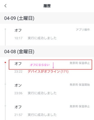 「保温開始」では温湿度計が20℃以下になったらプラグをオンにする。という動作条件を作ります。実際には育苗マットの冷え始まる時間や暖まりだす時間に時間差があるので、この設定でピッタリ温度が変動するわけではありません。また、通信トラブル(温度を認識できなかった、命令が伝わらなかったなど)により動作しない場合もあります。