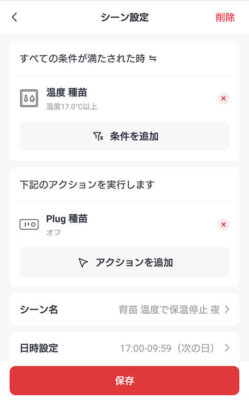 シーン設定では日時設定で管理する時間を指定することもできます。夜から朝は温度管理して、昼間は自然の温度変化に任せることができます。