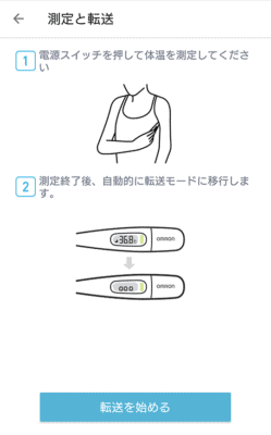 スマホで記録するためには、測定してすぐに転送する必要があります。体温計の通信は測定から2分後に自動で終了してしまいます。転送できなかった分をあとから転送することができません。