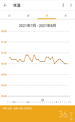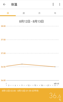 体温のタイルを開くとグラフで確認することができます。「日」のグラフでは転送した時間毎に見ることができます。週以降はグラフが1日の平均値で表示されます。