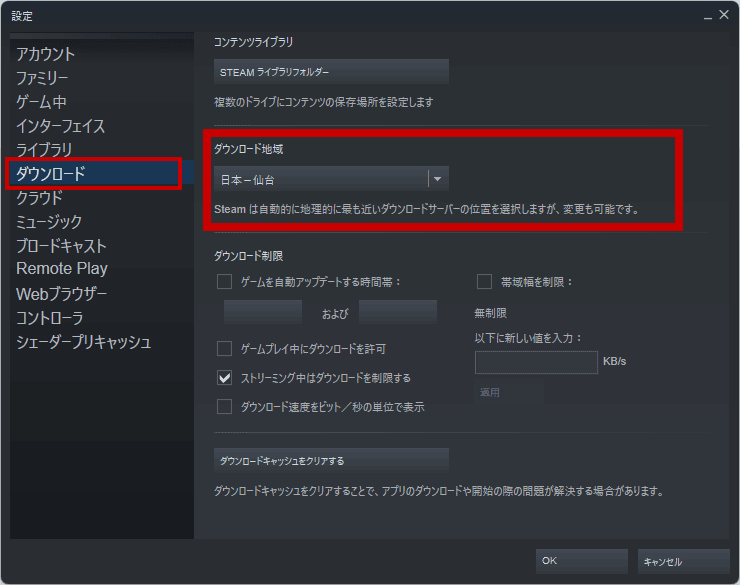 東京のサーバーが混雑するようなのでSteamのダウンロードサーバーを東京から仙台に変更しました。