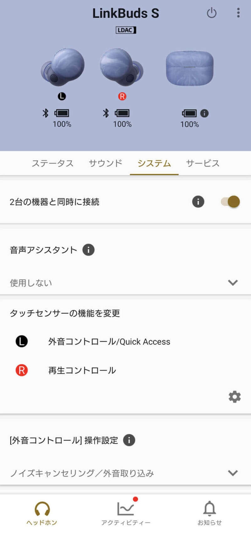 本体のタッチ操作は私は左に外音コントロール(ノイズキャンセルと外音取り込みの切替)、右に再生コントロール(再生と停止)にしています。2つの機能しか割り当てができないので、音量操作はスマホやPCなどの接続先の機器側で操作します。本体のタッチ操作での音量変更はやりにくいです。