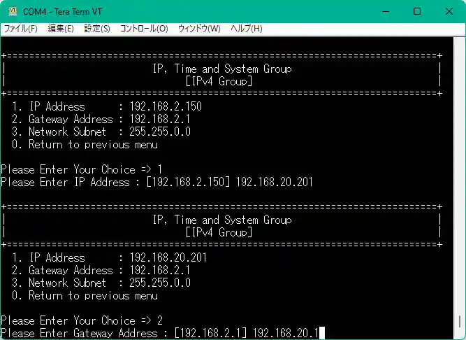 ターミナルソフトまたはTelnetで、ご利用のネトワークに合わせてゲートウェイ(ルーターのアドレス)とIPアドレス(UPSのアドレス)を書き換えます。