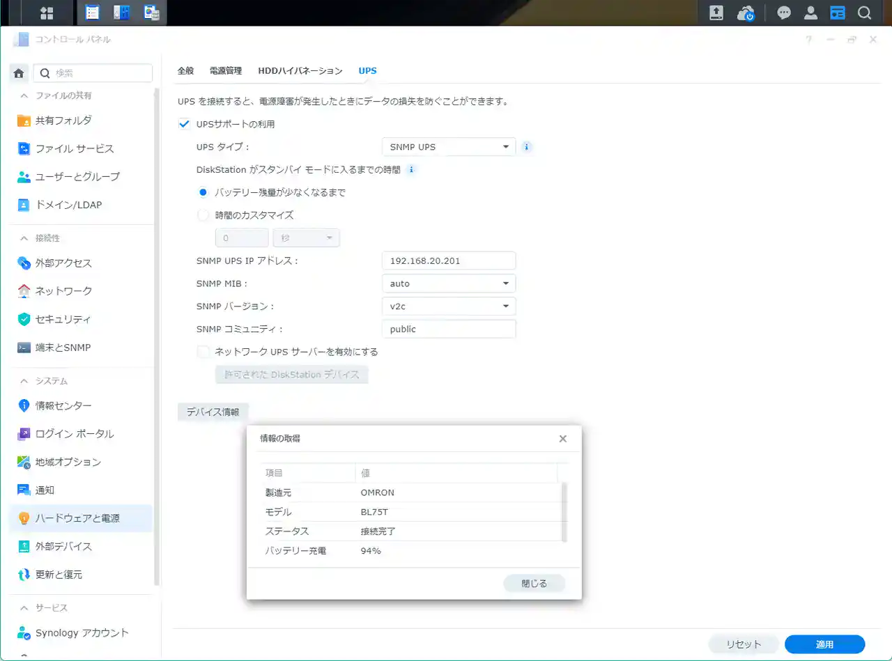 Synology NAS Diskstation (DS218)の場合は[コントロールパネル \ ハードウェアと電源 \ UPS]で設定することができます。