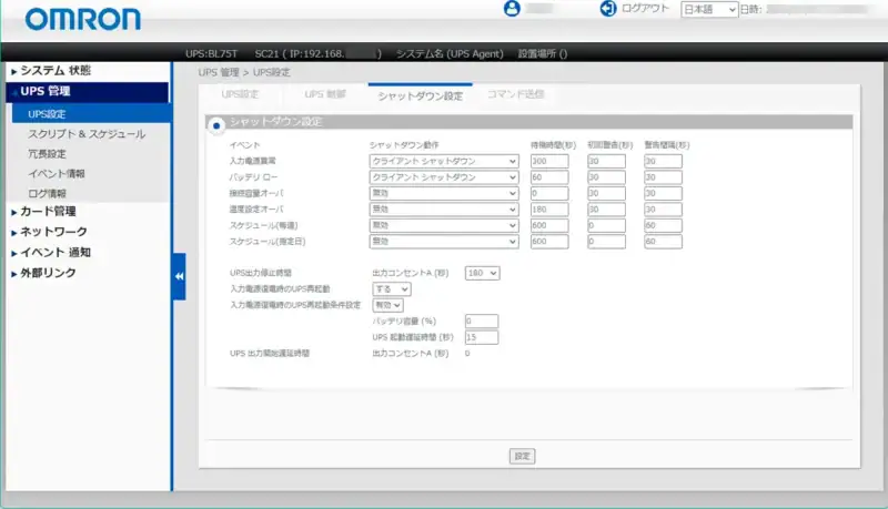 ログインして UPS管理>UPS設定>シャットダウン設定 を開きます。ログインしないと確認だけで設定の変更ができません。