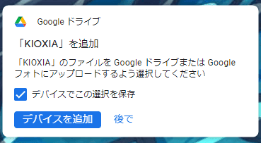 「デバイスを追加」を選択すると自動でアップロード、「後で」を選択すると自動ではアップロードしません。Googleドライブに保存したいファイルは後で自分でアップロードするという意味ですね。