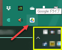 タスクトレイに常駐している「Googleドライブ」のアイコンをクリックして、右上の歯車マークの設定メニューを表示します。設定機能は歯車マークや丸3つ「・・・」のアイコンになっていることが多いです。