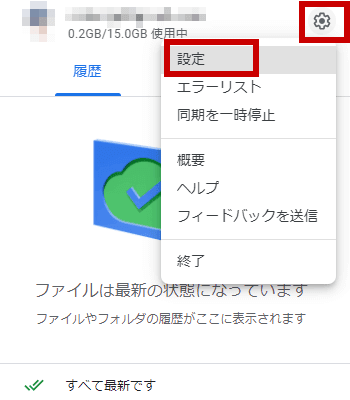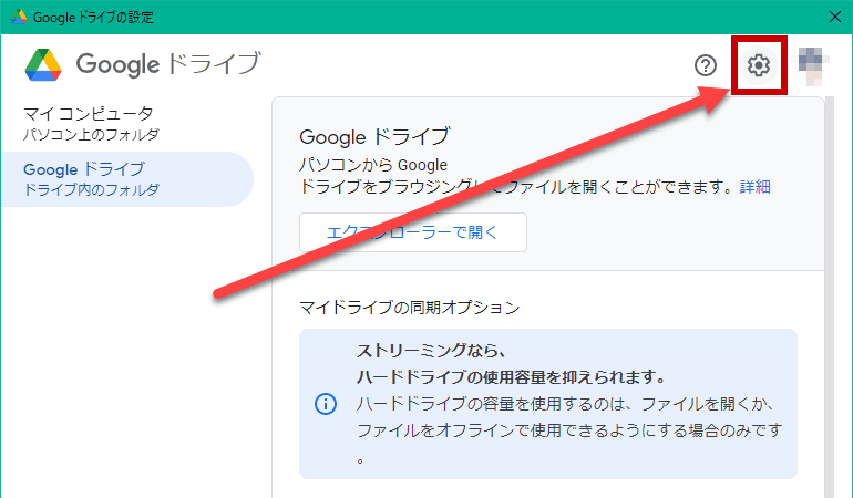 「Googleドライブの設定」ウィンドゥが開いたら、右側の歯車マークは開きます。