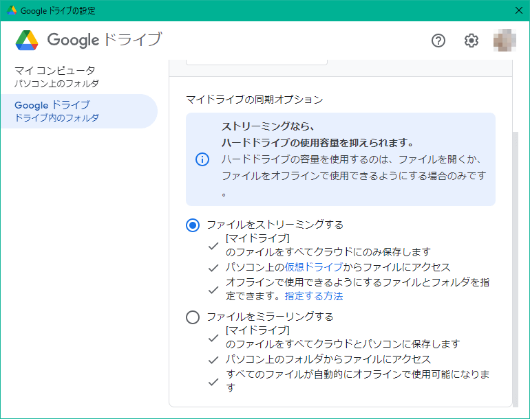 「ファイルをミラーリングする」を選択した場合はGoogleドライブをPCのフォルダに同期します。更新されたファイルはバックグラウンドでアップロードやダウンロードされます。