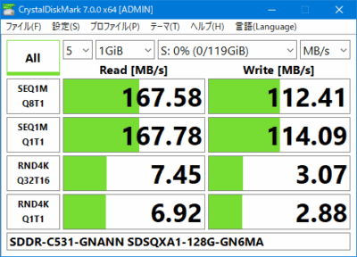 SDカード変換アダプタを使用してSDカードソケットに挿した場合と、そのままmicroSDカードソケットに挿した場合で性能に違いはありませんでした。