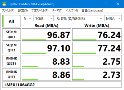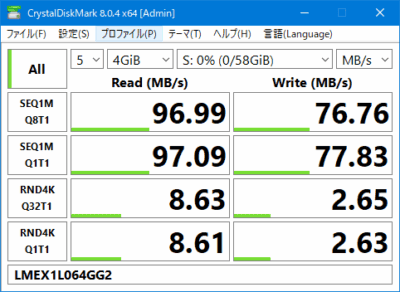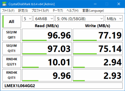 読込速度は97MB/s、書込速度は77MB/s。