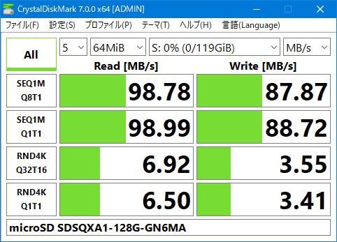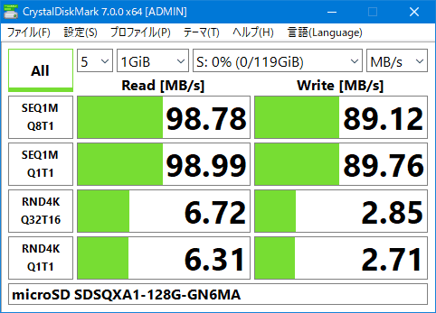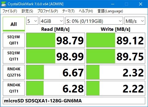 読込速度が98MB/s、書込速度が89MB/sとなりました。