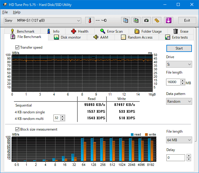 ここではSD変換アダプタを使用して、SONYのカードリーター MRW-S1/T1 を使用して性能を測定しました。