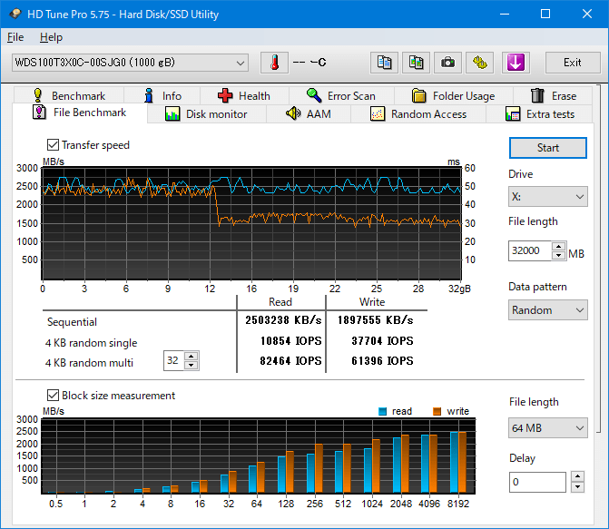 「File Benchmark」で32GB分の動作を見てみますと、12GB超えたところで書き込み2500MB/sから1500MB/sへと下がっています。書き込みキャッシュの容量をオーバーするとおおきく低下するようです。それでもSATA SSDの500MB/sよりは3倍速いですね。12GB以上の連続した書き込みはゲームをインストールするときやバックアップから復元して書き込むときでしょうか。普段の書き込みは2500MB/sぐらいで行えます。
