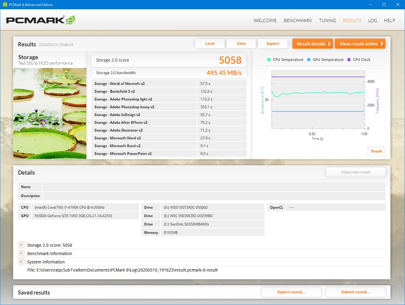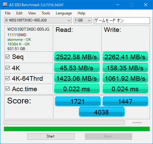 ゲームモードがオフだとスコア5058で速度495.45MB/s。
