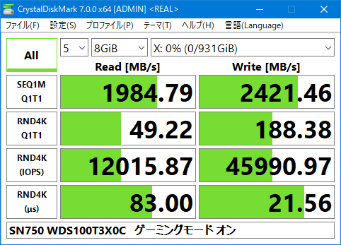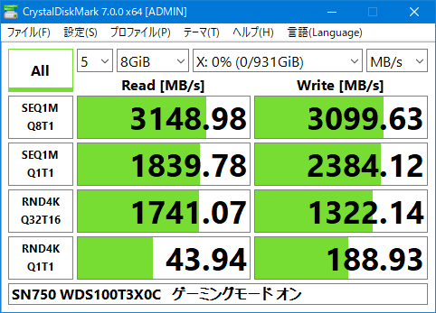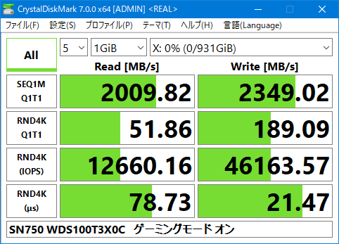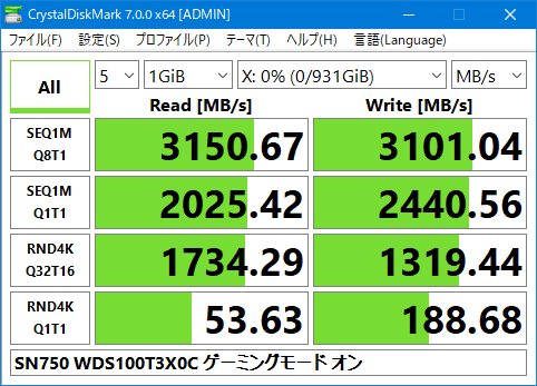 SN750にはゲームモード(Gaming Mode)がありますが、ゲームモードでの性能差はほとんど分からず。一般の人には気にする必要が無いレベルです。ゲームでシビアに読込性能が必要なる場面では前もってメモリに読み込まれているのが通常ですので、動作や操作には影響の無い誤差に近いものです。