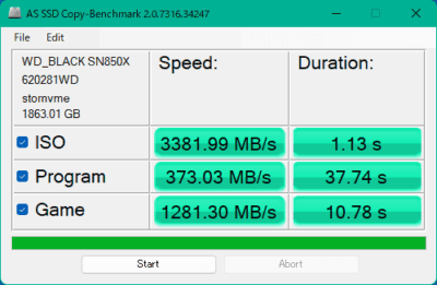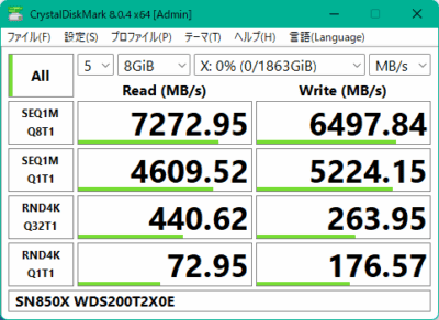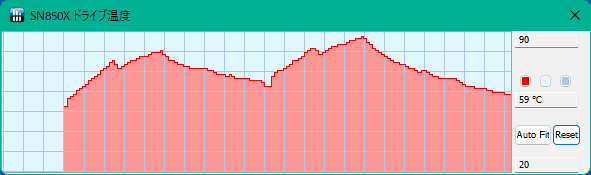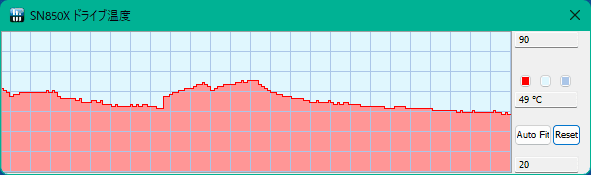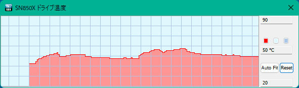 SN850Xの動作時の温度範囲は0~85℃とありますが、ヒートシンク無しで温度が超過してても性能が制限されてる感じはありませんでした。