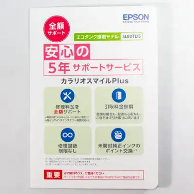 5年間の修理費用が保証される「カラリオスマイルPlus」の全額サポートプランを付けて購入しました。本体が高価なプリンターなので、修理費用を気にせずに修理に出せる安心感は大きいです。※修理料金が全額サポートプランは8800円、半額サポートプランは5500円となっています。