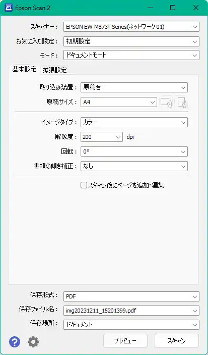 本体操作ではなくPCソフトからスキャンを実行する場合は保存先を選択できます。この場合「Epson Scan Smart」ではなく「Epson Scan 2」を直接起動するのが使いやすいです。