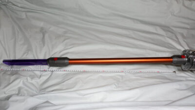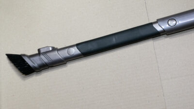 延長パイプの先に取り付けるとおよそ90cm先のホコリを吸い出せます。つなぎ目が太いので、細い隙間は20cmまでです。隙間ノズルの代わりに「フレキシブル隙間ノズル」を使うともっと薄く長く使えます。