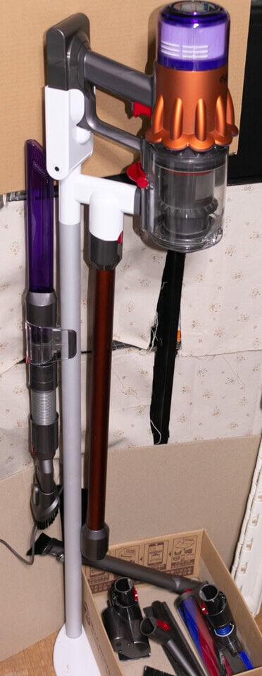収納は私は充電ドッグに延長パイプを収納、ツールクリップに延長ホース+コンビネーションノズルと隙間ノズルを収納しています。残りは充電ドッグの土台の上にダンボル箱を置いてその中に入れています。ツールクリップがもう一つ欲しいですが売ってないです。