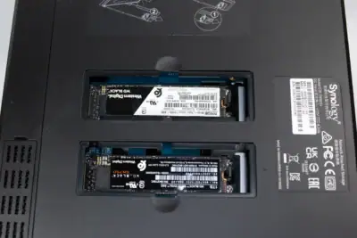 ここでは余っているWD Blackを使用していますが、NAS用ではないSSDを使用すると発熱や書き込み寿命によるトラブルが起こりやすいので注意が必要です。DS923+ではM.2ソケットが風通しの悪い底部にあります。