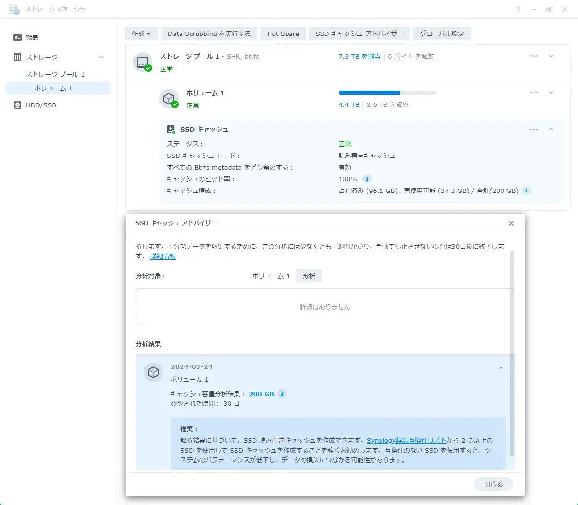 Synology 純正のSSDは容量の割に書き込み寿命(MTBF)が大きく設計されています。空き容量を大きく確保せずにディスクの容量全体を使っても大丈夫なのかもしれません。ただ、キャッシュとして使う場合は容量が大きなWD Redを使うのが安上がりになります。