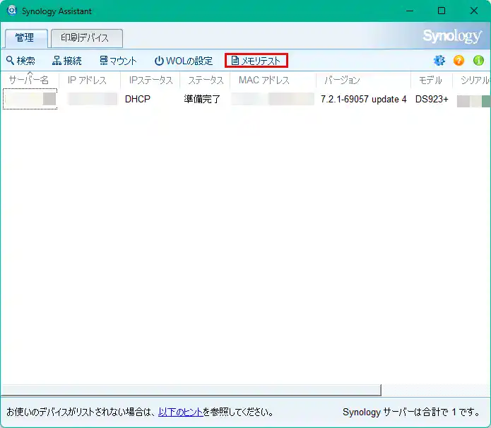 Synology Assistant メモリ診断ツール